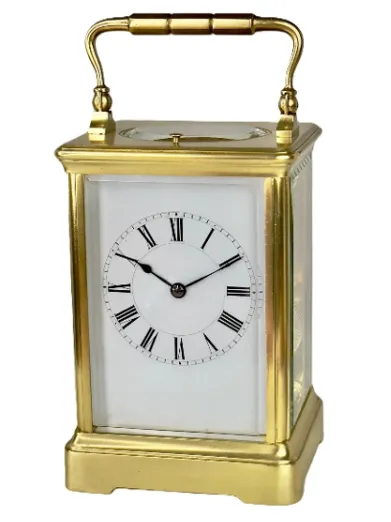 To set the clock, most carriage clocks have a hand setting arbour located in the middle of the back plate. Place the rear end of the winding key over the arbour and move the hands gently round the clock to the correct time. If you have a striking carriage clock, make sure that when you turn the hands allow each hourly strike to finish its sequence to avoid the strike mechanism jamming. If the hands lock do not force them. Turn the hands back a minute or so only and allow the chime to finish and then gently move the hands on. Please remember that the hands should not be turned back more than 3 to 4 minutes as this will damage the levers that trigger the strike mechanism.